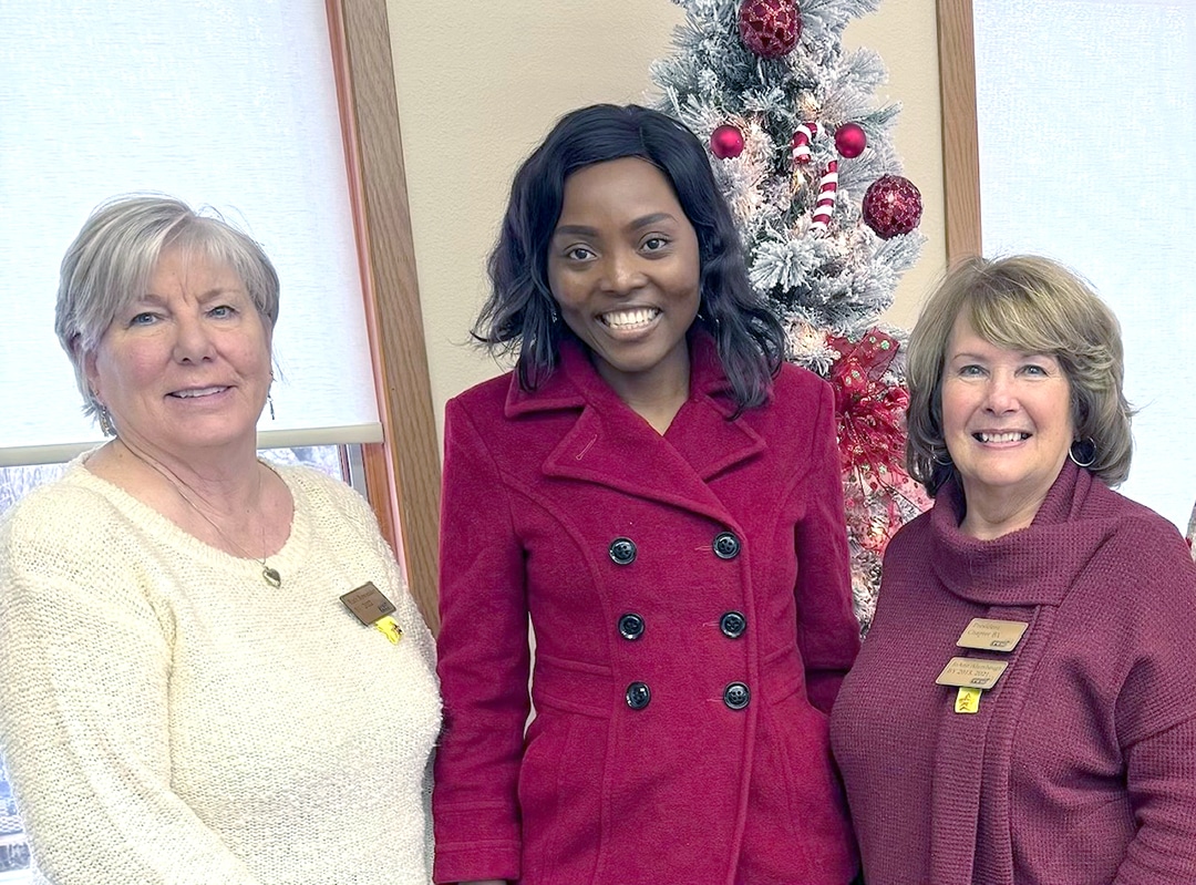 Cutline: Ruth Rowedder, Chapter BY International Peace Scholar chair (left), and JoAnn Alumbaugh, president of P.E.O. Chapter BY (right) are pictured here with International Peace Scholar recipient Charity Nya Njeshi, who recently received her doctorate from Iowa State University.