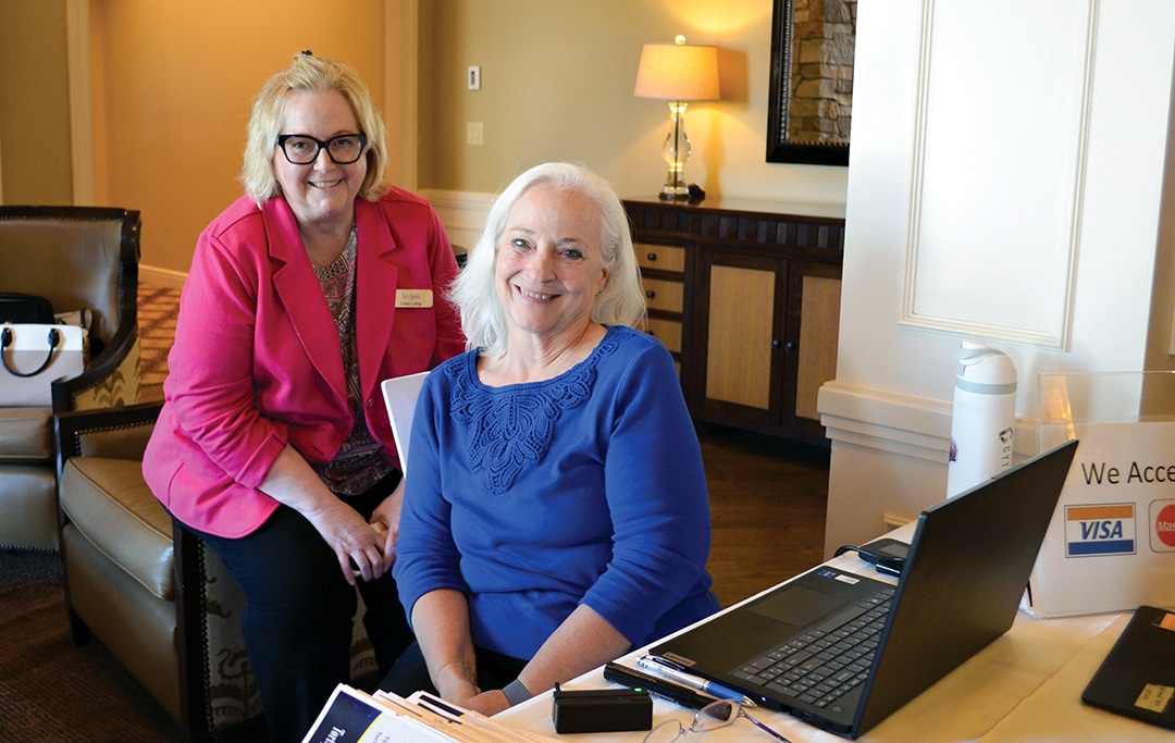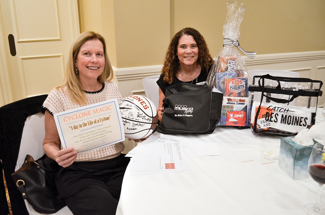 Lisa Long, Waukee, co-chair of the event committee, and Joanie Coates, Ankeny, committee member, prepare to check in guests at the benefit.