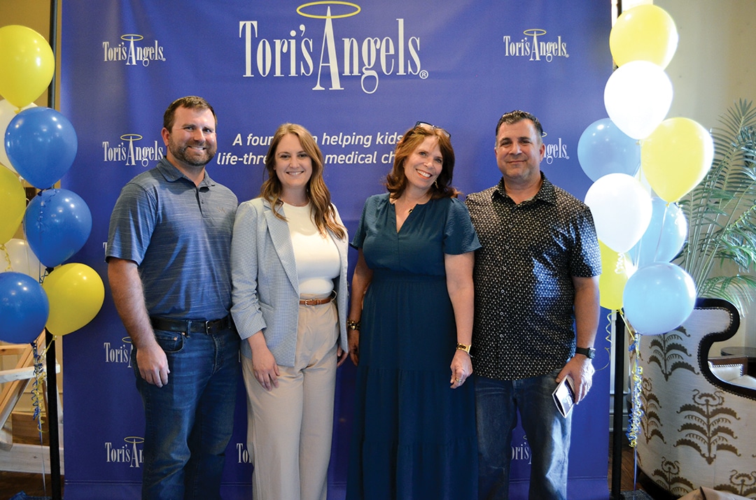 Thomas Wilson, Pella, Bre Neel, Waukee, Joy and Mark Kellerman, West Des Moines, pose at the Tori’s Angels banner.