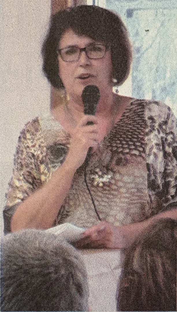 NO FOOLING. Linda Wendl, president of Women For Panora’s Future, welcomes guests to the club’s April Fool’s Day dinner.