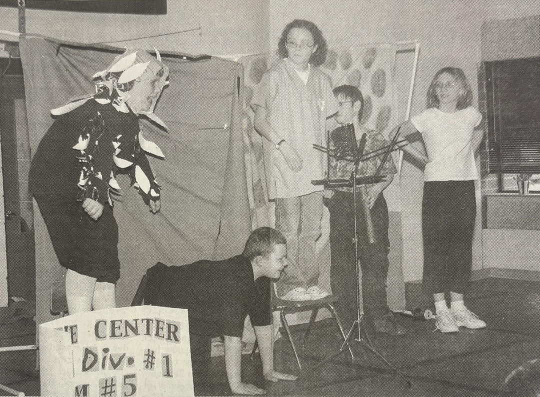 ACTING UP. Standing on a chair, Jared Calvert acts the part of a harpy eagle during state Odyssey of the Mind competition at Guthrie Center Saturday. Other elementary team members who resolved the problem, The Jungle Bloke, are, from left, Ryan Black, who was a black jaguar; Therese Frels; Eddie Halbur; and Madison Crowder.