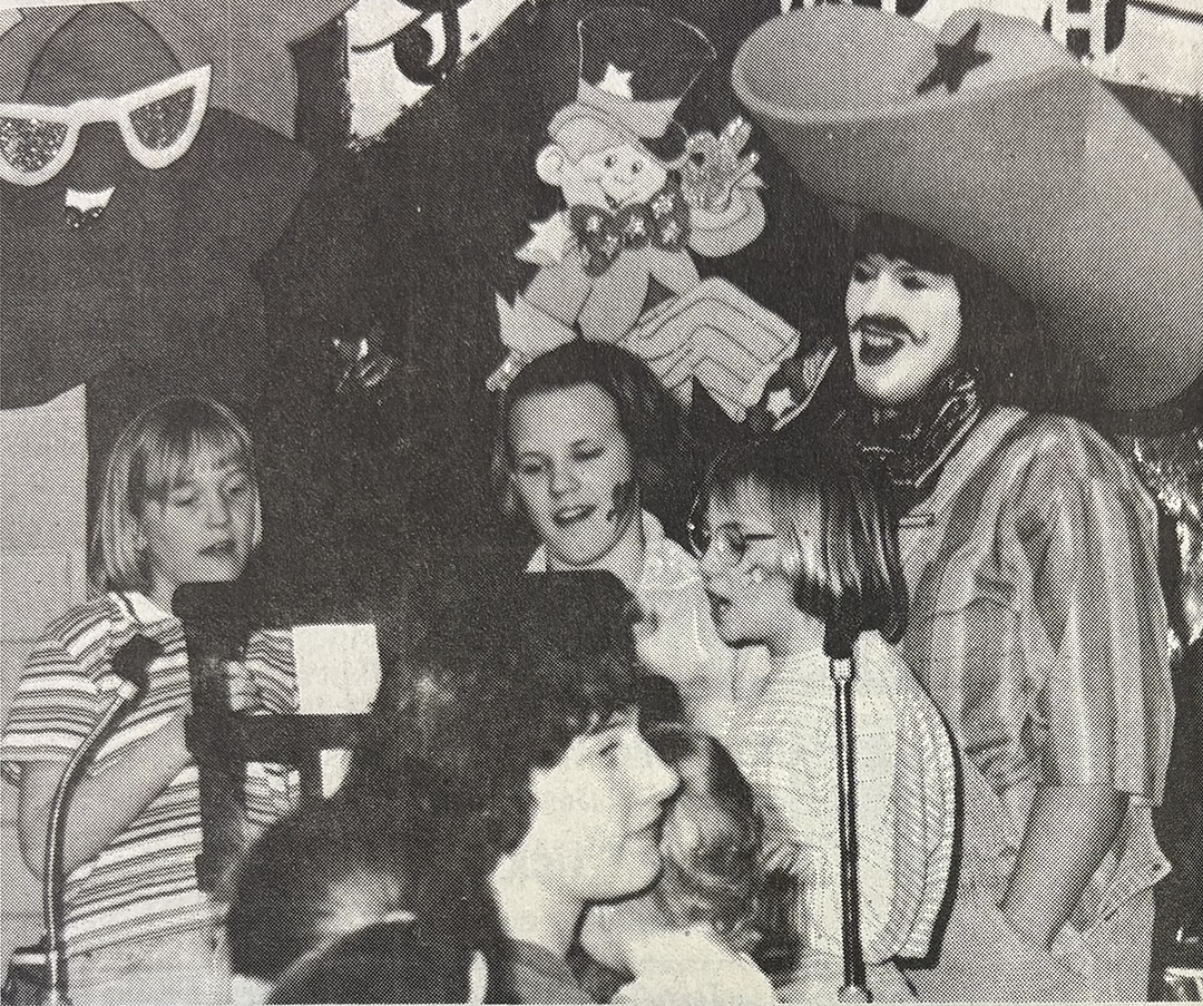 SING ALONG. An elementary version of karaoke kept things lively in the gymnasium. Elementary marshal Jolene Sheeder (school secretary) harmonizes with Julie Larson, left, April Buttler, center, and Bethany Benton.