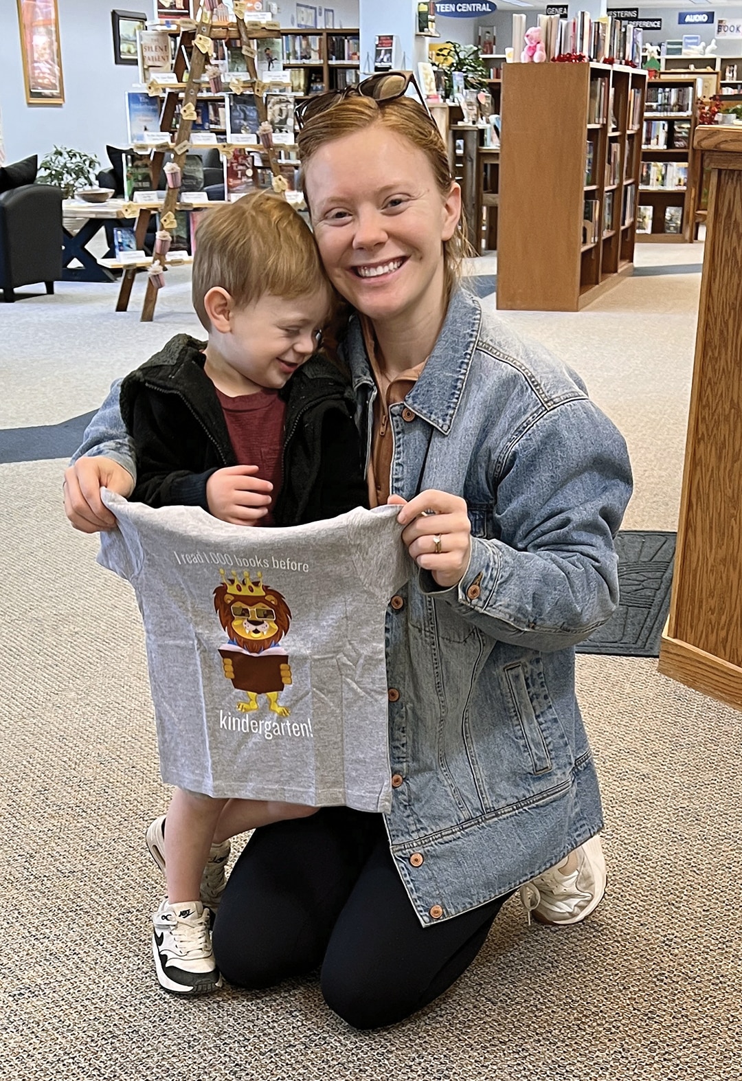 Caden and his mom show off Caden’s new shirt that he won for reading 1,000 Books Before Kindergarten. Patrons with preschoolers in their lives are reminded that 1,000 Books Before Kindergarten is a FREE program to help preschoolers be reading-ready when they go to kindergarten. Sign up on the website or at the library.