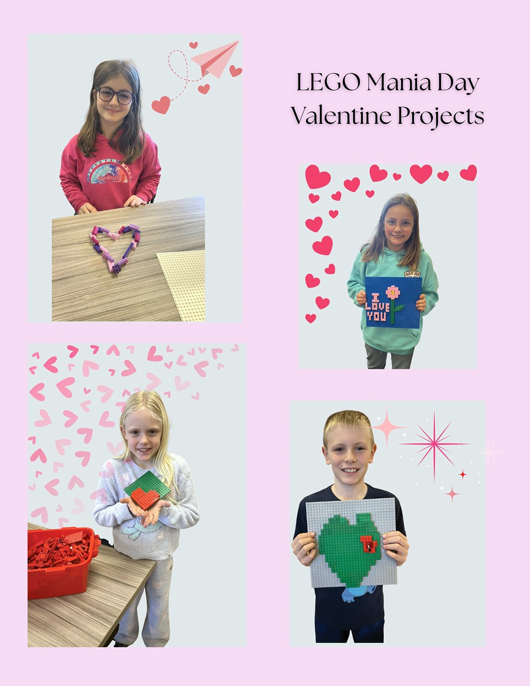 The February LEGO Mania Challenge was to create a Valentine’s Day card from LEGOs. These are the final results. LEGO projects are displayed in the MJB Library during the month. The next MJB LEGO Mania Day will be Wednesday, March 4 at 2.
