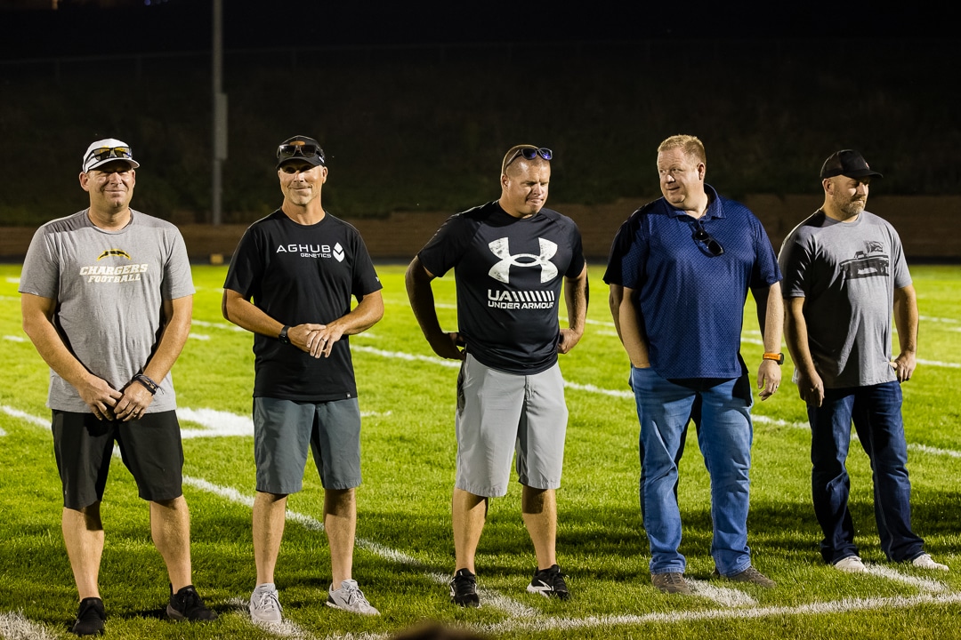 Members of the 2000 Adair-Casey Bomber football squad were honored during halftime of the ACGC Chargers game against Nodaway Valley on Sept. 12. Adair-Casey won the state title in 2000 and 2001, the first two years that Iowa schools competed in 8-player football.