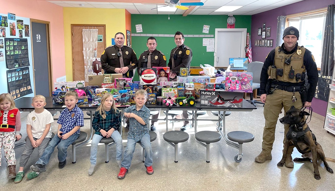 Iowa State Patrol officers and Boys and Girls Club kids pose with toys collected.
