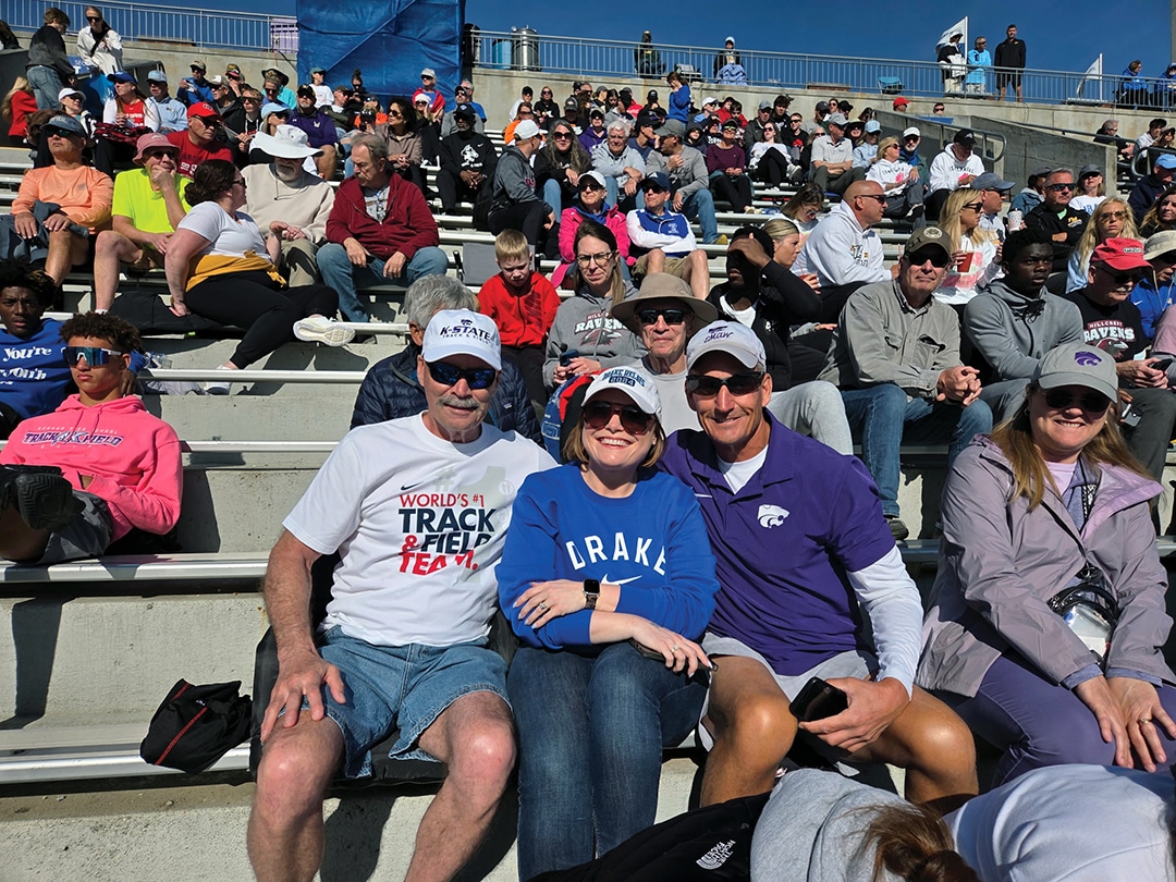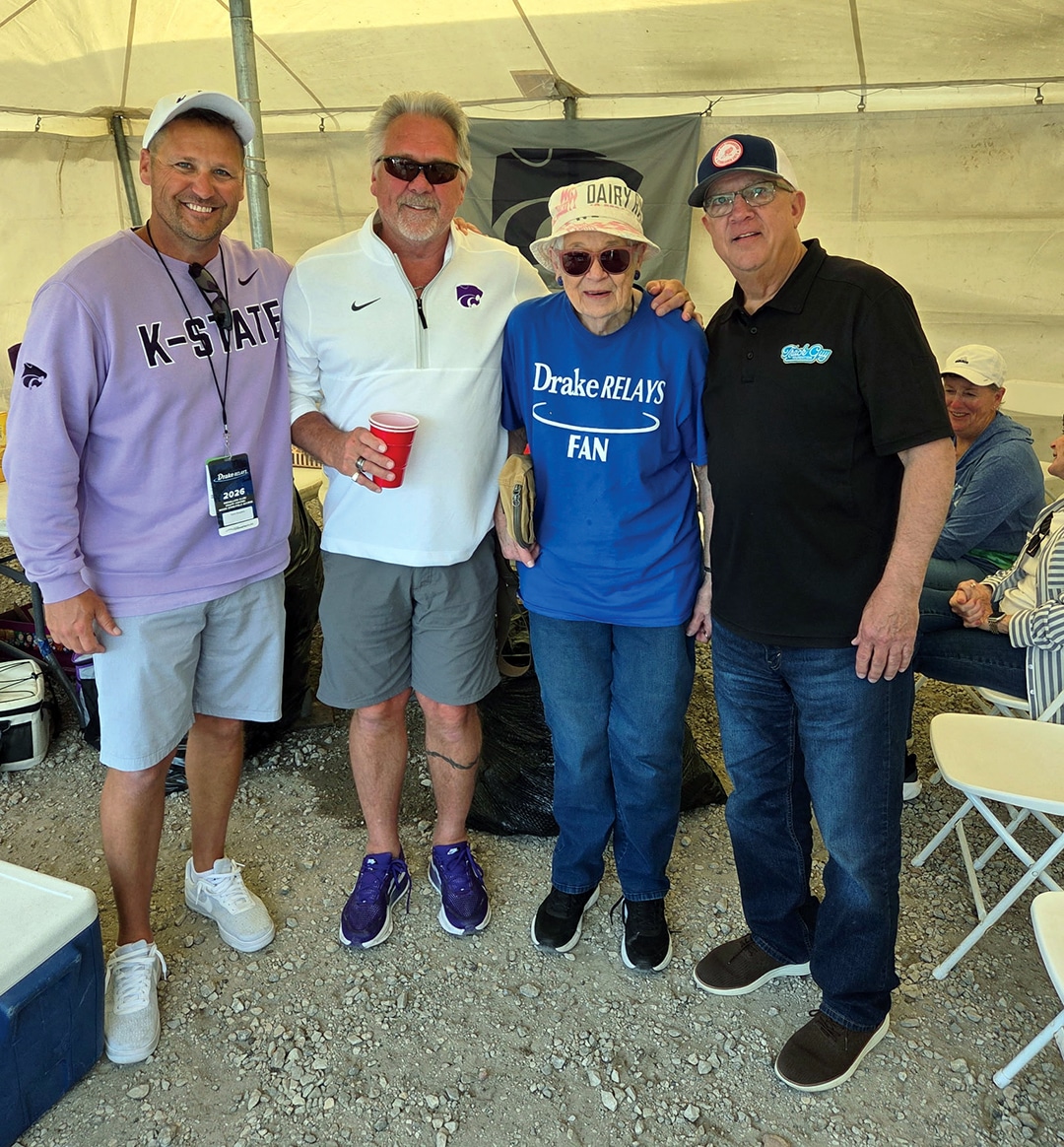 Kansas State Track Head Coach Travis Geopfert, Gary Geopfert and Doris Bennett along with Mike Jay, who is the Drake Relays announcer, founder of The Track Guy, and announcer for NCAA track championship finals and the Olympics trials.