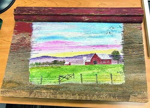 “I’ve been doing a lot of reclaimed wood. At one time, I painted on driftwood,” Konz said. “I have a lot of friends that bring me leaves and barn boards and things.”