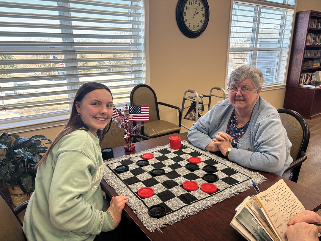 Rylee Robson and Bonnie Hunt enjoy a game of oversized checkers.