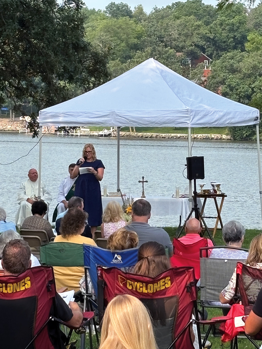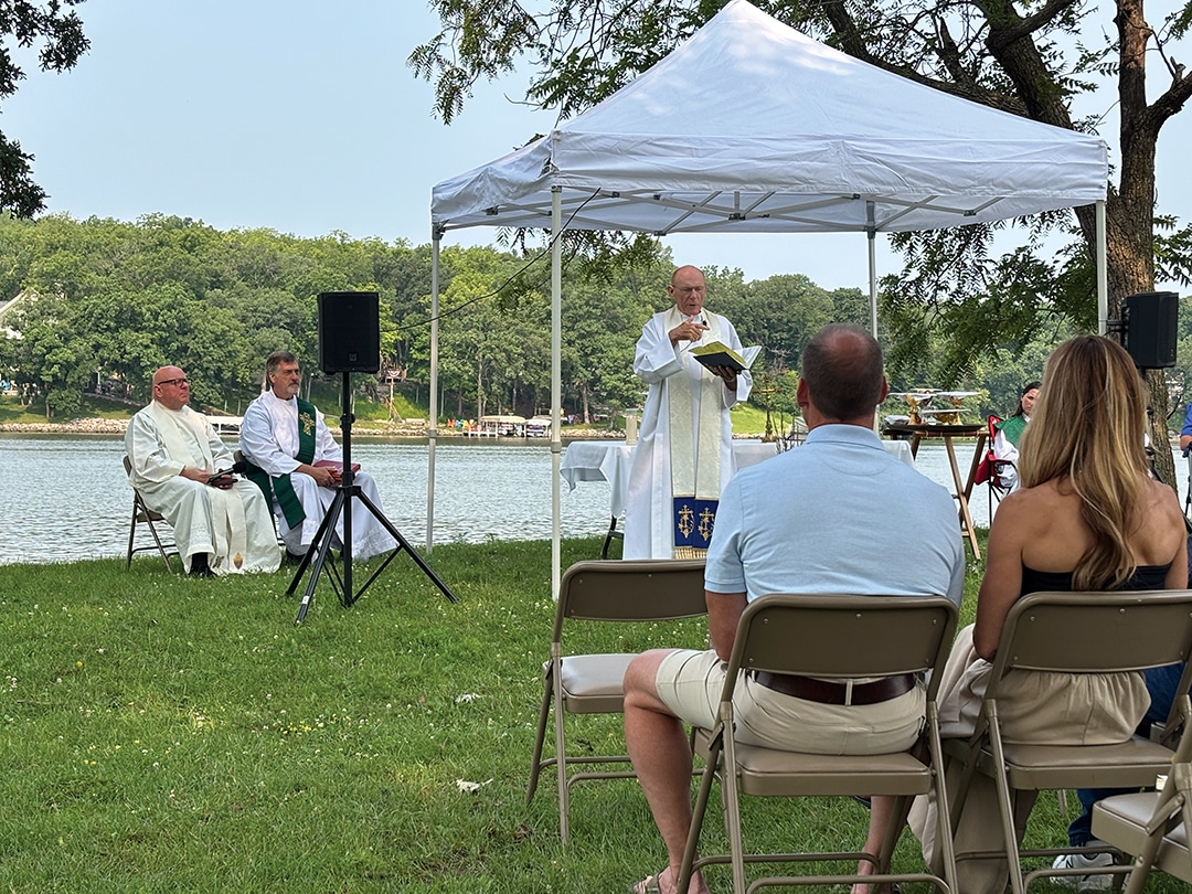 The Catholic parishes of St. Mary’s (Guthrie Center), St. Patrick’s (Bayard) and St. Cecilia’s (Panora) held an outdoor mass at Boulder Beach at Lake Panorama starting at 9:30 a.m. A dinner, hosted by the Panora Knight of Columbus, was held after the service. A crowd of more than 150 was estimated to have attended.