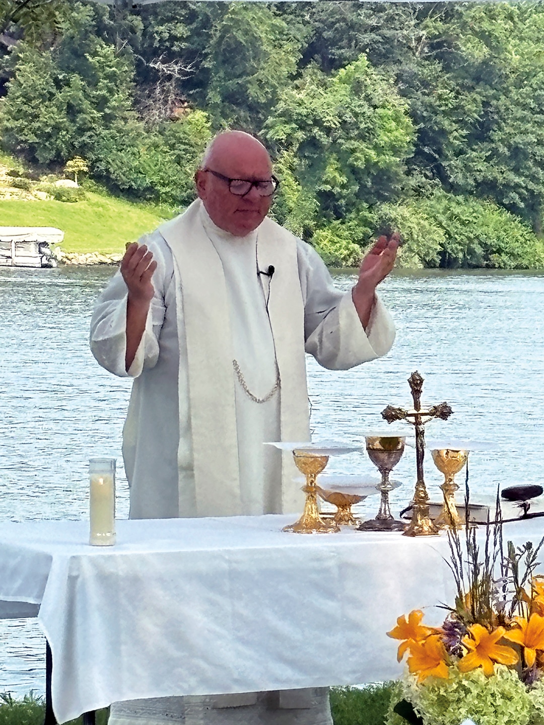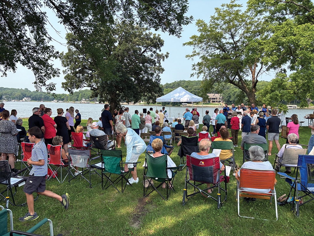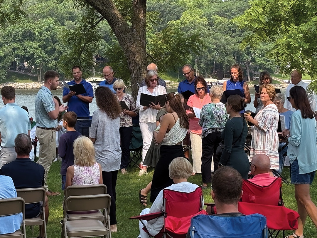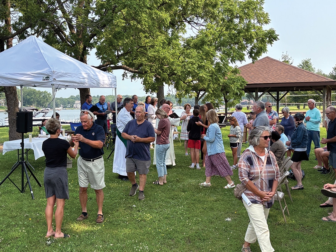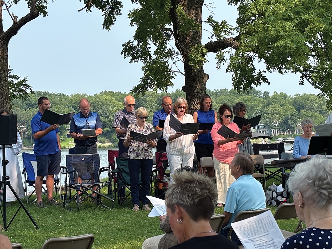 Dan Wilhelmi and Tom Block Knights of Columbus member Joe Weisz and his daughter, Olivia Weisz Knights of Columbus members Mike Carey, Jeff Houston and Lynn Weisz prepare the food. Attendees enjoyed a beautiful Sunday morning. Father Higgins shares a story. The choir performs during communion. More than 150 people attended the lakeside service. Deacon Dennis Patrick and Father Ray Higgins offer communion. The lakeside communion service. Father Ray Higgins blesses the wine and hosts. Members of the choir encourage everyone to sing along. Father Francis Higgins, the uncle of Father Ray Higgins, offered the homily. Becky Wahl delivered one of the readings at Sunday’s mass.