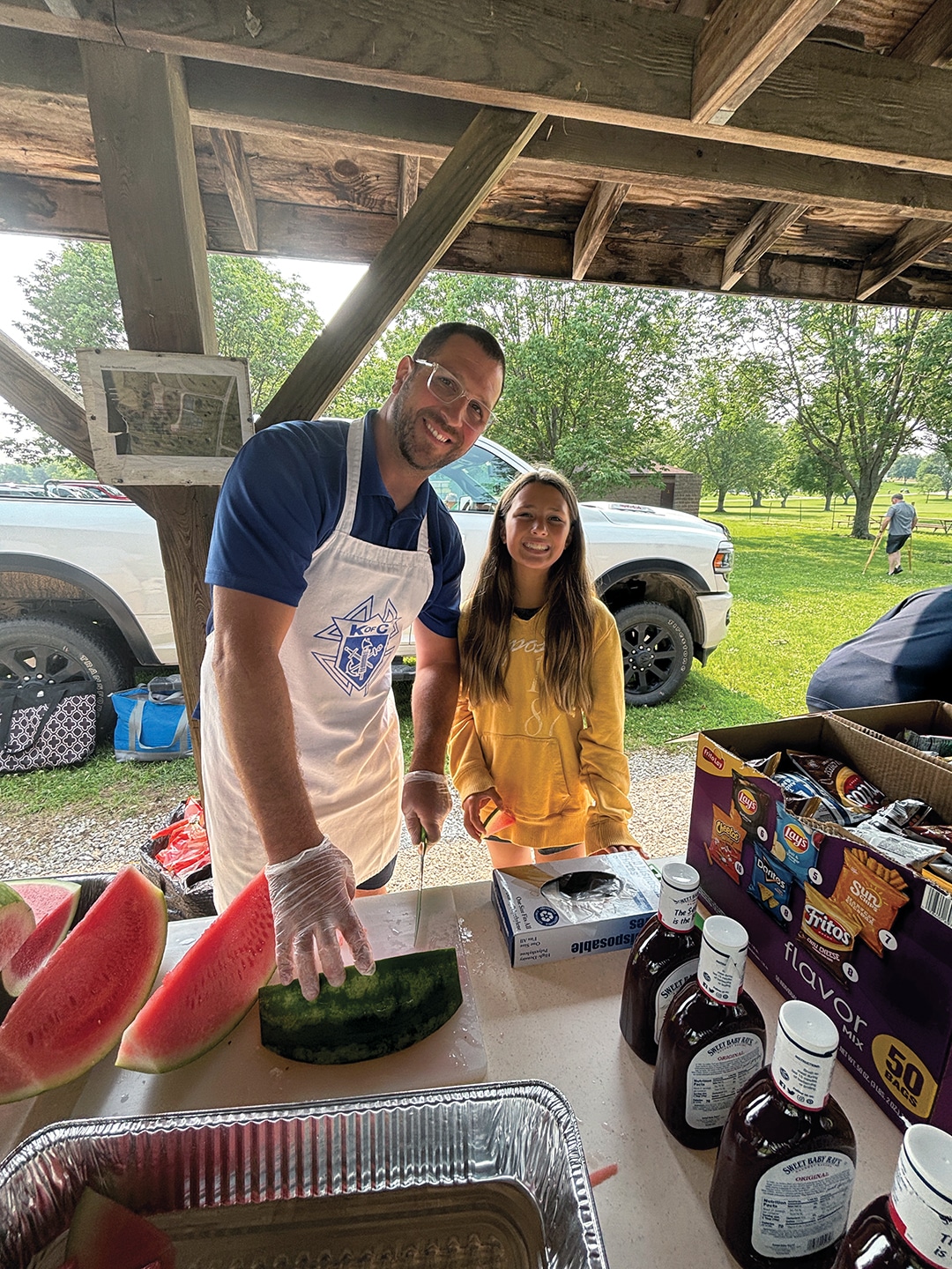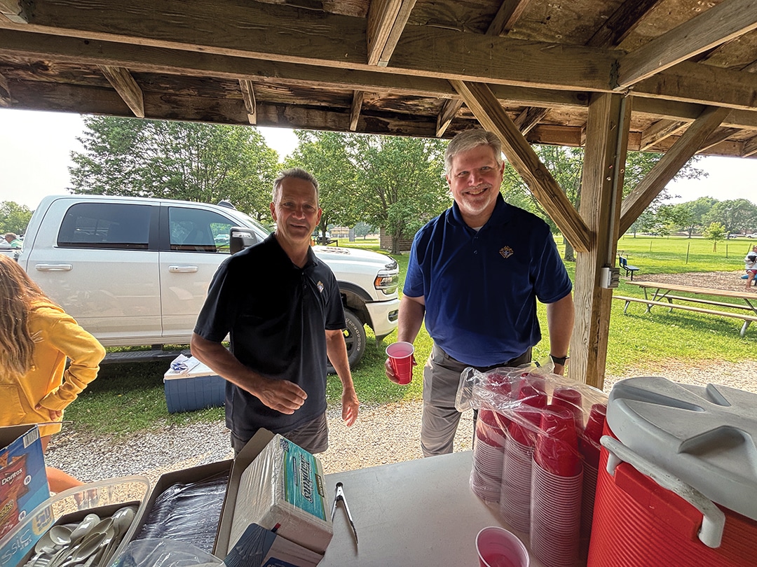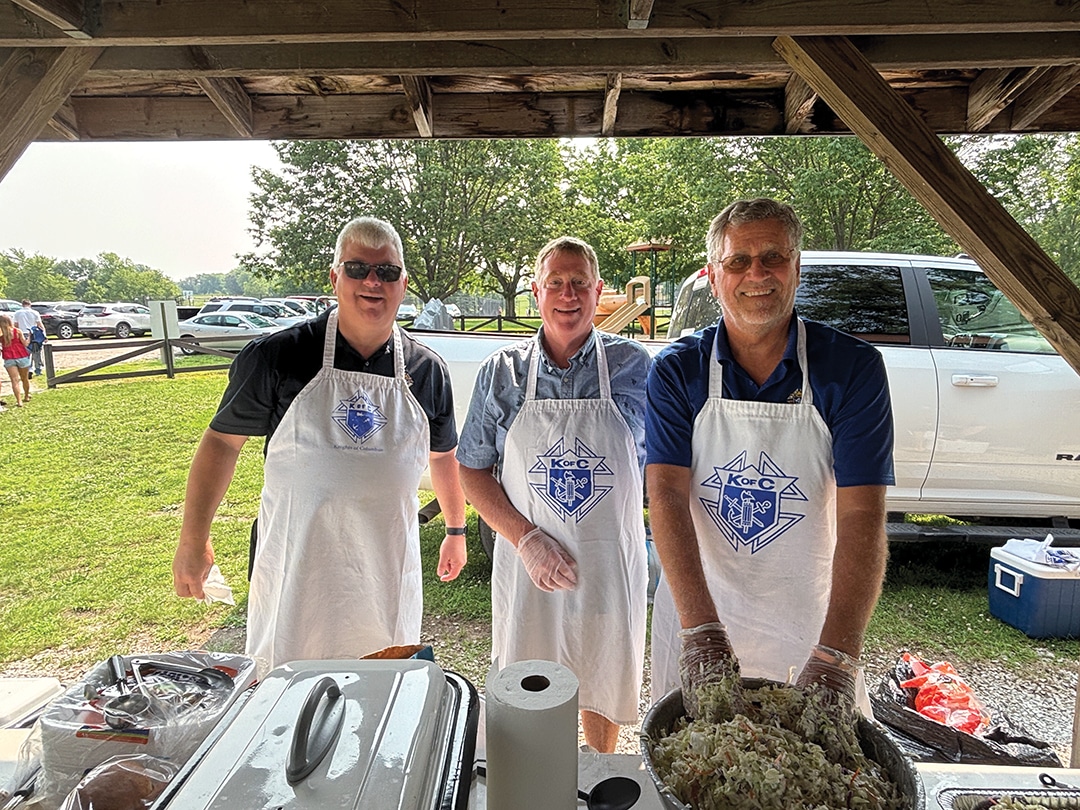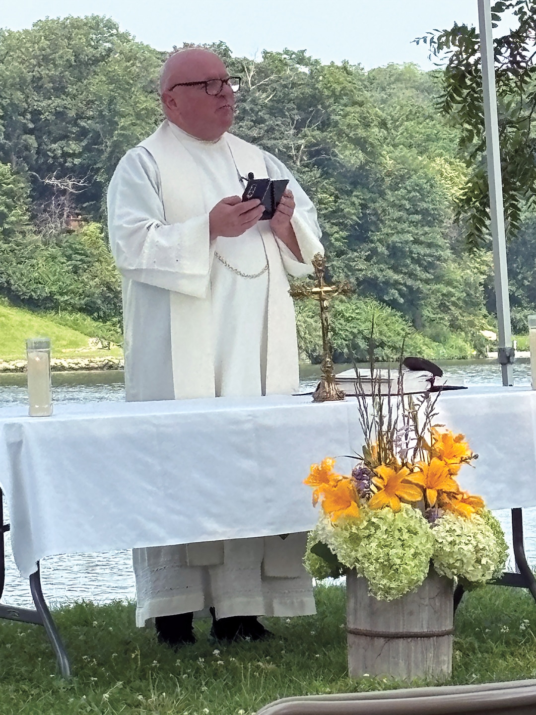 Dan Wilhelmi and Tom Block Knights of Columbus member Joe Weisz and his daughter, Olivia Weisz Knights of Columbus members Mike Carey, Jeff Houston and Lynn Weisz prepare the food. Attendees enjoyed a beautiful Sunday morning. Father Higgins shares a story. The choir performs during communion. More than 150 people attended the lakeside service. Deacon Dennis Patrick and Father Ray Higgins offer communion. The lakeside communion service. Father Ray Higgins blesses the wine and hosts. Members of the choir encourage everyone to sing along. Father Francis Higgins, the uncle of Father Ray Higgins, offered the homily. Becky Wahl delivered one of the readings at Sunday’s mass.