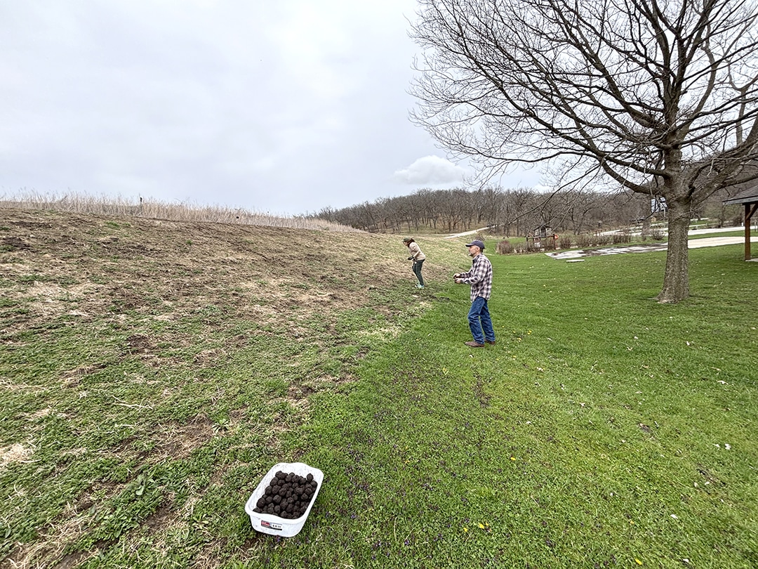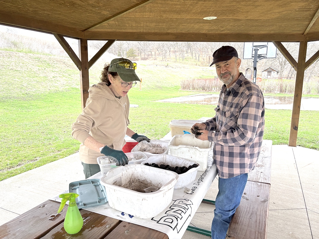 Anne Riordan and Jon Tesdell mix soil and seeds into balls.