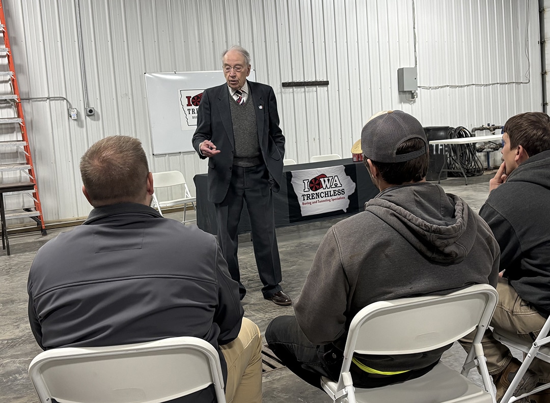 On April 9, Senator Chuck Grassley held a question-and-answer talk with employees of Iowa Trenchless and others in Panora. Approximately 40 people were on hand. Questions covered a range of subjects including infrastructure, water quality, health insurance, the Iran war situation, partisanship in politics, affordability and the outlook heading into the November 2026 midterm election.