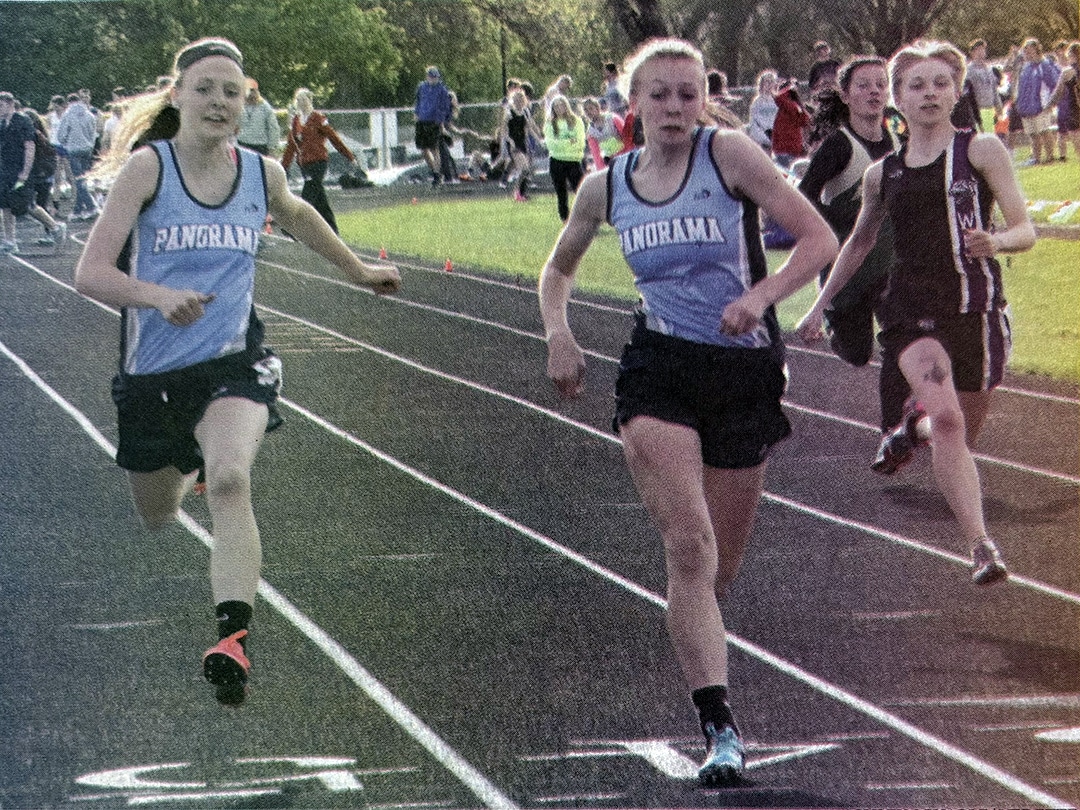 DASH! Panorama’s Hope Arganbright (left) and Maddie Knapp (right) race to the finish in the girls 100-meter dash during the West Central Activities Conference meet Tuesday, May 3 in Guthrie Center. Knapp finished ninth and Arganbright 10th overall.
