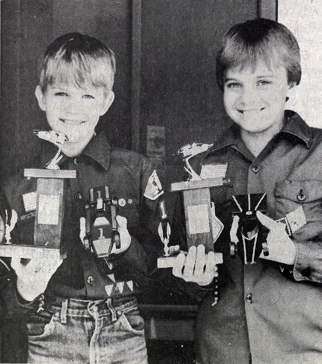 BEST OF SHOW. A Pinewood Derby racer constructed by Andy Eckerman, right, won first-place show honors at the Panora Cub Scouts Pinewood Derby. Scott Klocke received the second-place trophy and Donnie Madison, absent for photo, had the third-place racer in the show division.