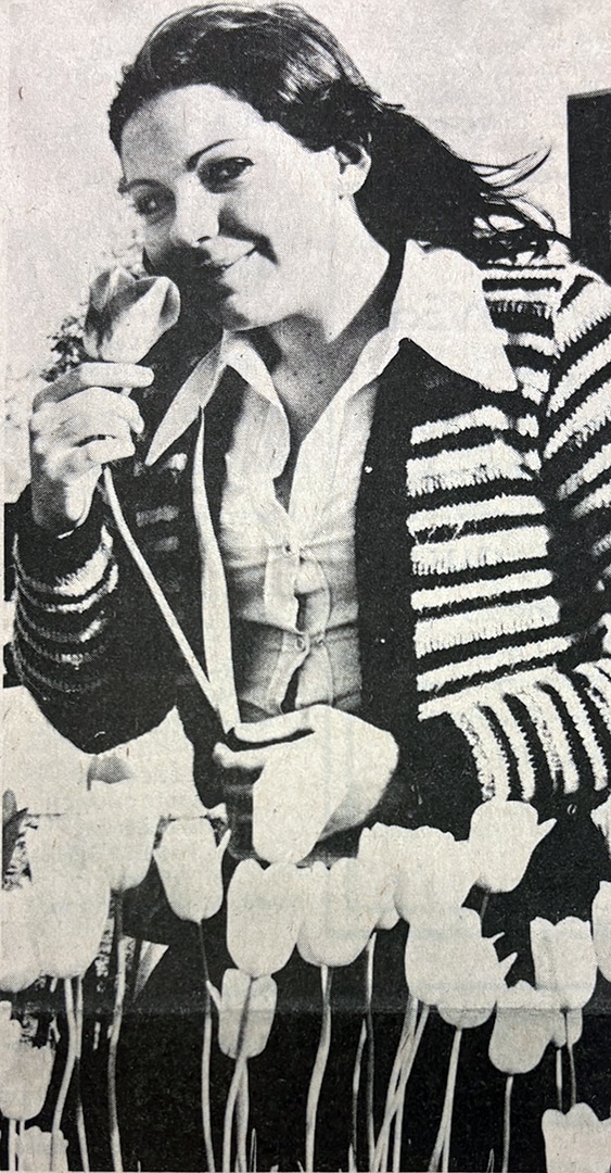 TULIP TIME IN GC. Hopefully tulips in Pella are blooming like ones in Guthrie Center. Miriam Grotta, GCHS exchange student from Brazil, examines a long-stem beauty at the Guthrie County Courthouse.