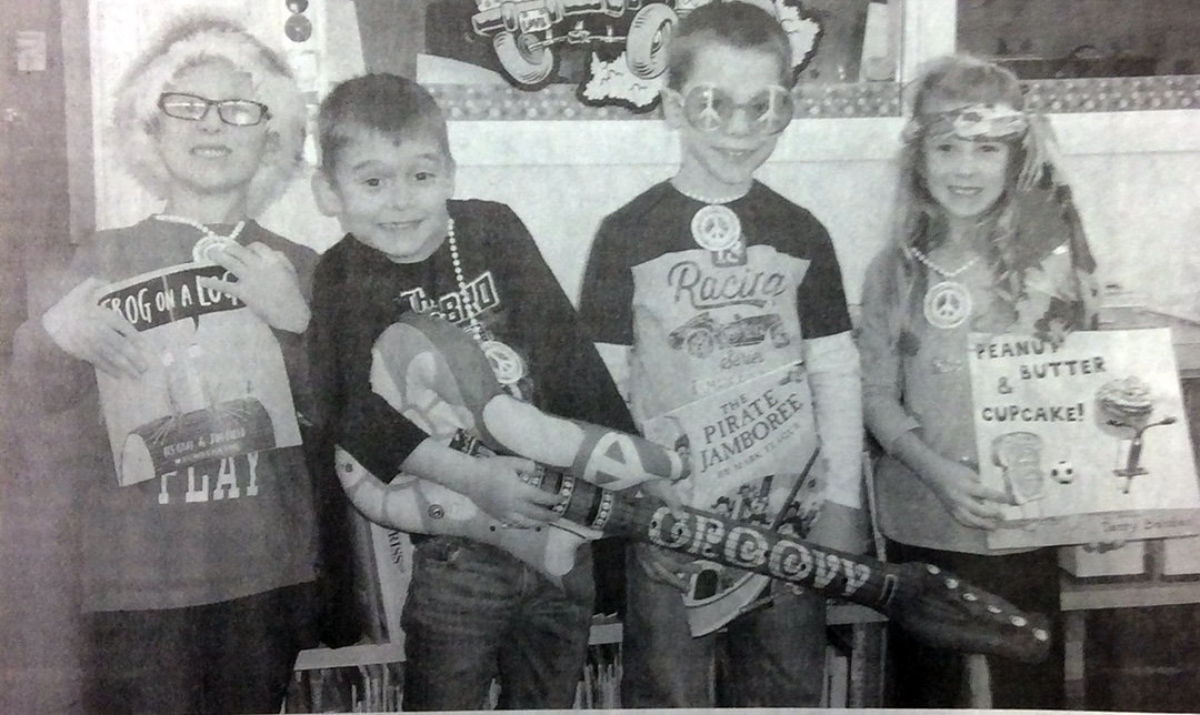 FEELIN’ GROOVY. Panorama students in Mrs. Heffernan’s first grade class (from left) Parker McGuire, Zander Lopez, Alex Padilla and Maci Bauer promote the school’s Spring Book Fair with the theme “Peace. Love. Books — Feelin’ Groovy Book Fair.” The Scholastic Book Fair is Wednesday, Feb. 10 and Thursday, Feb. 11 in the Panorama Elementary Library. Families, faculty and the community are invited to attend this fun reading event that helps inspire children to become lifelong readers.