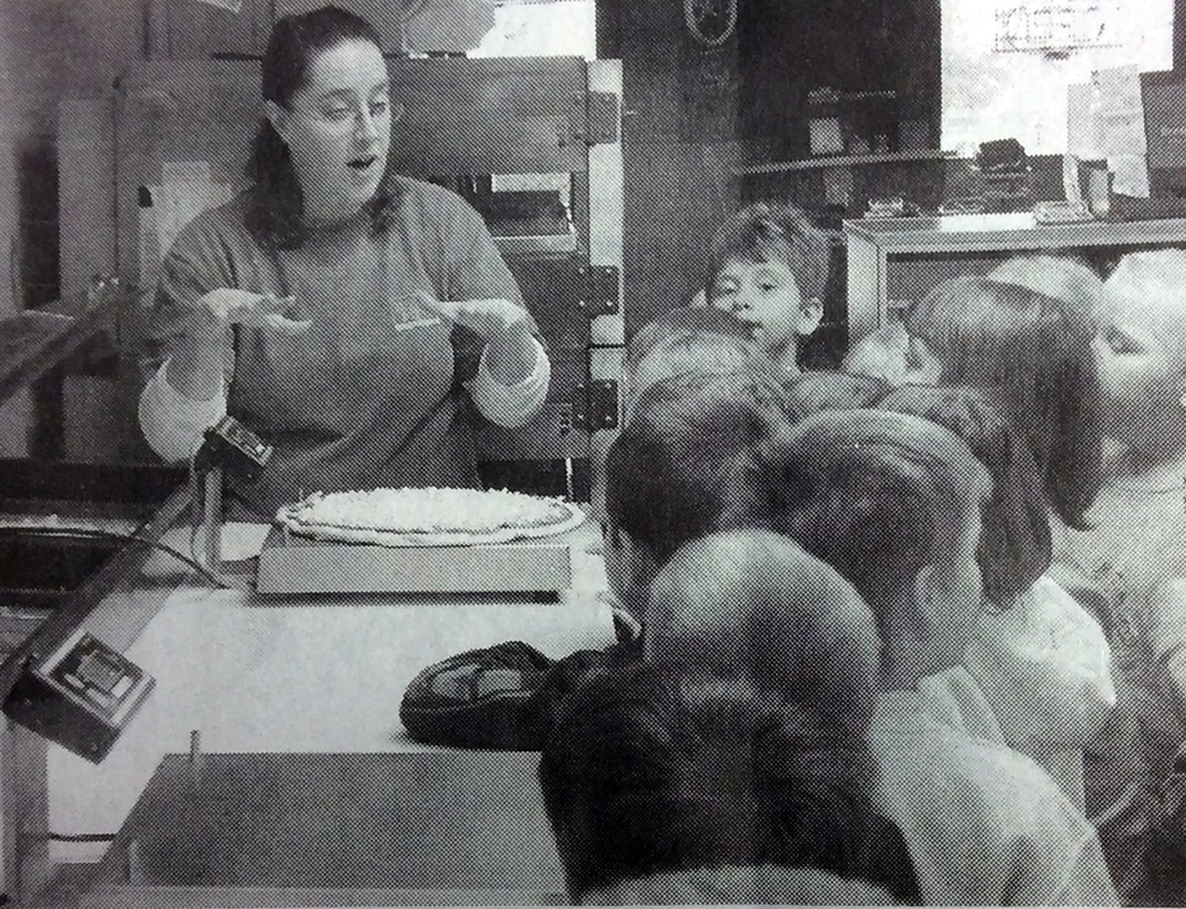 SPECIALLY SEASONED PIZZA SAUCE AND DOUGH. Nicole Hansen of Breadeaux Pizza explained pizza-making when Mrs. Pittman’s kindergarten class toured the local business.