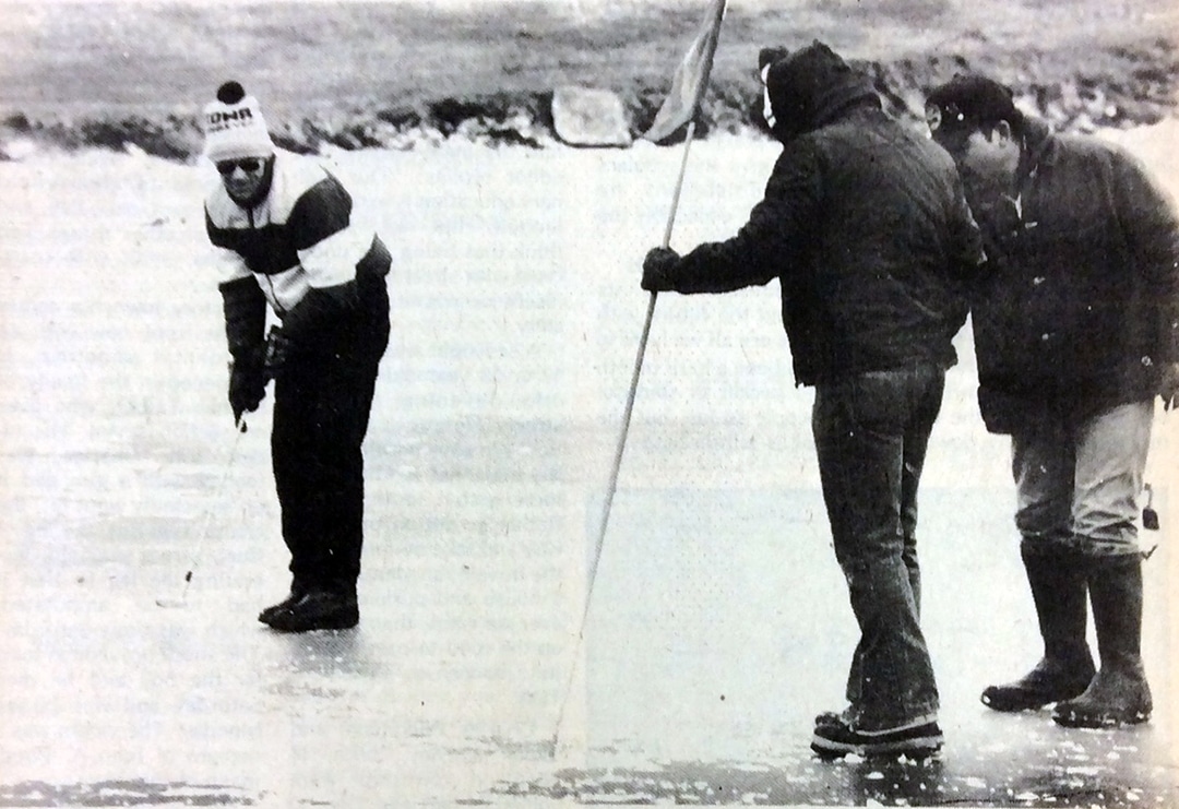 ICE FOLLIES. Dennis Duke, right, and Bill Boyle of Guthrie Center, holding the pin, watch as Gary Morrow of Guthrie Center sinks a putt on the ninth hole during the Fin and Feather Association’s first annual golf tournament on Lake Panorama last Saturday. Chairman Steve Keith said $100 each will be presented to the Panora boy scouts and cub scouts. The team of Leland, Bill and Randy Schuhardt of Perry and Alan Gilmore won first place with a score of 25, 11 under par. The second place team (26) was Dave Deardorff of Yale, Bob Hill of Adel and Steve Keith and Paul Wendl. Tying for third place (27) were the teams of Jay Hemphill, Steve Meacham, Doug Burgess and Red Lowe, Panora, and Bill Boyle, Scott Gonzales, Barry Monaghan and Dave Reinhart, Guthrie Center. Prizes were $120 for first, $80 for second and $40 for third, which was split.